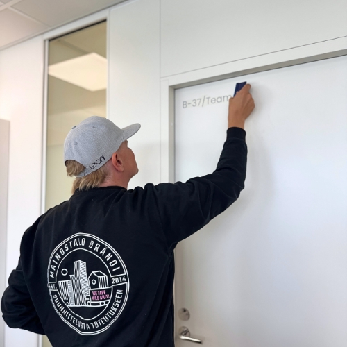 Kommunikointi oli nopeaa ja vaivatonta: kysymyksiin vastattiin heti ja sekä tarjous- että toteutusvaihe eteni ripeästi. Asennus hoitui huomaamattomasti muuttokiireiden keskellä – teippaukset “vain ilmestyivät” paikoilleen. Tyylikäs ja laadukas lopputulos sai Elomaticilta täydet pisteet.