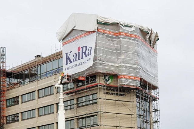 Yrityksen suurkuvatuloste rakennuksen julkisivussa, logolla ja viestillä varustettuna