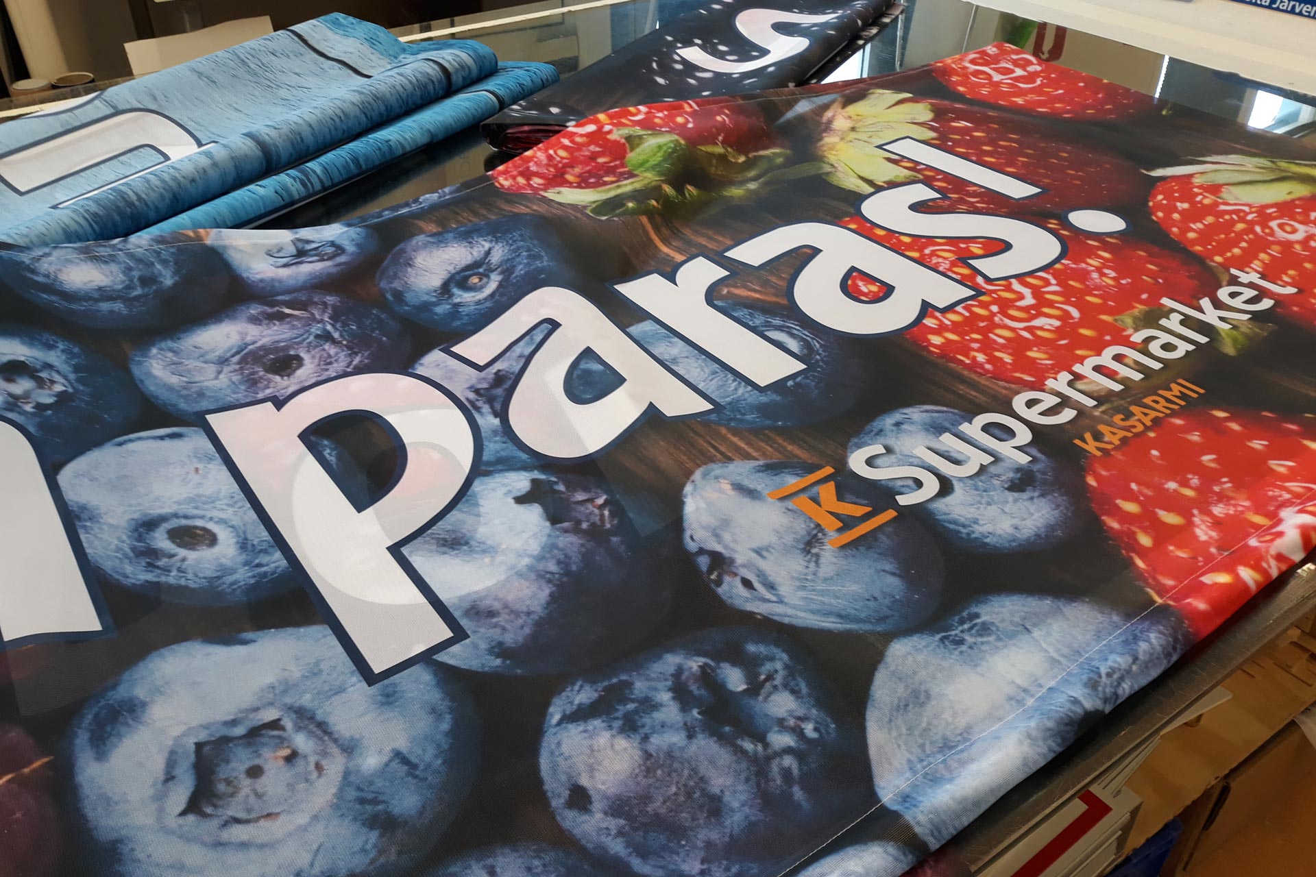 Isot mainospinnat, julisteet ja banderollit voidaan toteuttaa edullisesti suurkuvatulostuksella, jolloin saat vaikuttavan lopputuloksen ilman suurta budjettia. Tulosteiden vaihto ja uusiminen on helppoa, mikä tekee niistä sopivan valinnan myös sesonkikampanjoihin.